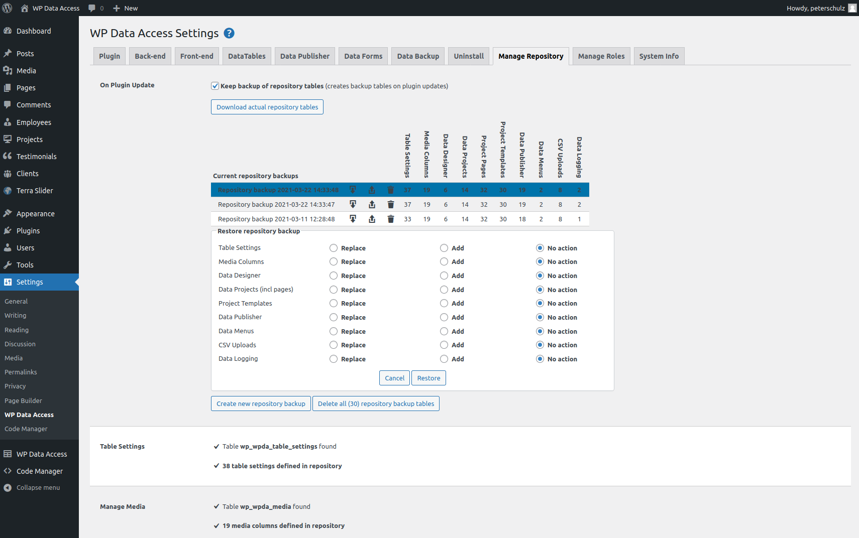WP Data Access creates a backup of all your repository tables each time the plugin is updated (unless disabled). This mechanism was added to prevent plugin users losing their repository data during an update failure. It has now been extended to allow plugin users to make interactive backups, download backups and restore backups partially or completely. These new features are available from: